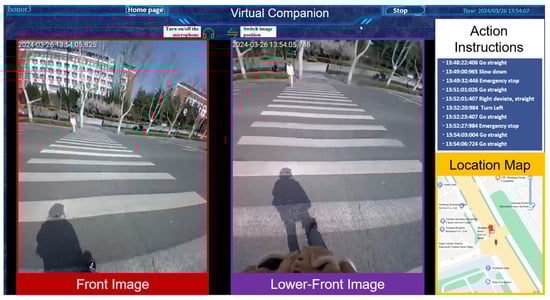 It aims to provide visually impaired users with real-time remote companionship and obstacle avoidance navigation, enhancing their sense of security and trust. The operator observes the user’s surrounding environment in real time through the backend interface (Figure 5), and provide real-time guidance and interaction to users through tactile and voice feedback, including the acquirement of user requirements, map navigation, and path planning.