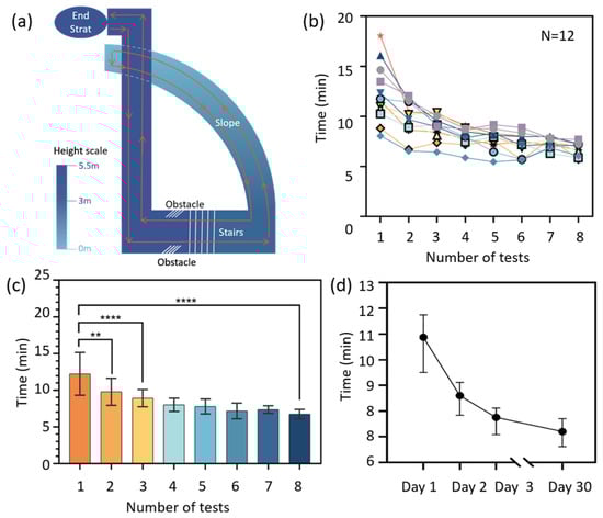 The easy-to-learn performance of the navigation system. (a) A diagram of the testing route. (b) The decrease in walking time with the usage time. (c) The relationship between user proficiency and testing number. Each column represents the average walking time, with error bars indicating standard deviation. The significant differences are as follows: ** p ≤ 0.01, **** p < 0.0001. Data in (d) show the median testing time of all 12 subjects.