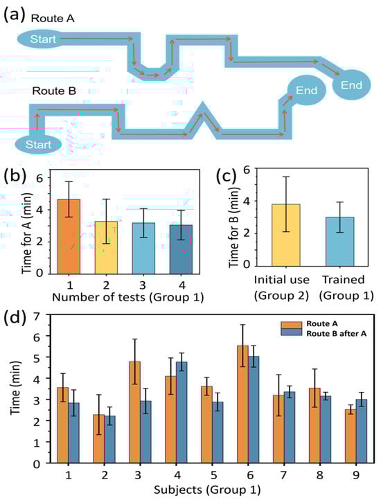 We tested the relationship between the time required to walk on a fixed route while wearing this device and whether one has been trained. Two fixed routes, A and B, with lengths of approximately 60 m each, were chosen for testing. These routes were located indoors at the Zhuzhou Disabled Persons’ Federation and both included elements such as straight sections, turns, and entering/exiting the room, as shown in Figure 7a. After an approximately 5 min training session on device usage, the blind subjects were divided into two groups. The first group (Group 1, nine subjects) and another two non-blind subjects walked route A four times in one day, followed by walking route B four times the next day. The second group (Group 2, nine subjects) walked route B four times in one day, without prior training on route A. All testing data are listed in Table S2 in the Supplementary Material.