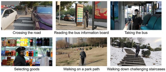 With the help of the MNVCS, the blind participants were not only able to walk safely in both open areas and narrow passages, but also to fulfil challenging tasks under the navigation and/or guidance of the system, such as crossing the road, reading the bus information board and taking the bus, going shopping to select goods, walking in a park, and walking up and down consecutive stairs, as illustrated in Figure 8. Scene testing videos for cycling, transportation and stair descending can be found in Video S1 in the Supplementary Material.