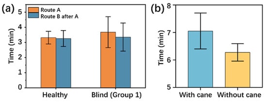 Difference testing results in non-blind and blind subjects. (a) Walking time comparison between non-blind and blind subjects on Route A and Route B. (b) Walking time comparison with and without the use of a blind cane on a fixed route. The column height is the average walking time on the same route, and the error bar is the standard deviation.