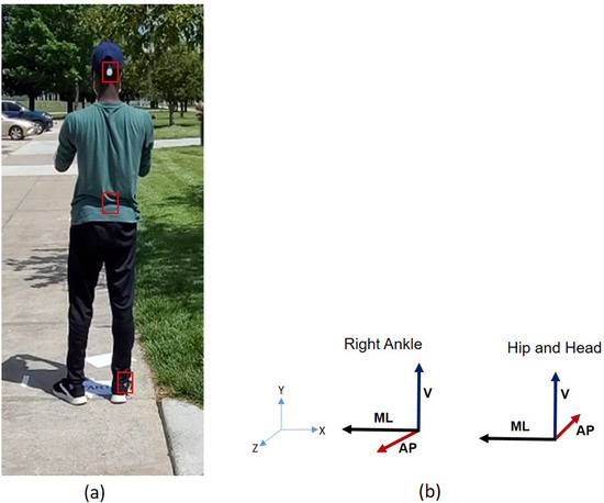 (a) Placement of sensors at three locations on a subject. (b) Accelerometers’ directions.