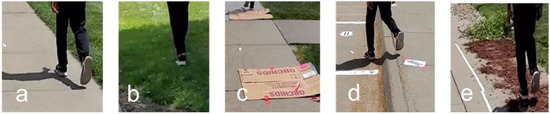 Good and typical irregular walking surfaces: (a) Good, well-paved segment (Type 0); (b) grass-covered segment (Type 1); (c) obstacles with physical obstructions (Type 2); (d) uneven surface segment (Type 3); and (e) debris-covered segment (Type 4).