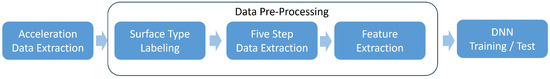To ensure a diverse and balanced dataset, we constructed 10 independent datasets for each sidewalk surface condition. As there are five different surface types, this resulted in a total of 600 datasets. Each dataset was extracted from acceleration sensor readings collected during pedestrian movement and consisted of 515 data points, which corresponded to a walking sequence of five consecutive steps. The selection of this window size was based on an analysis of step patterns and sensor signal characteristics to effectively capture the variations in movement across different surfaces.
