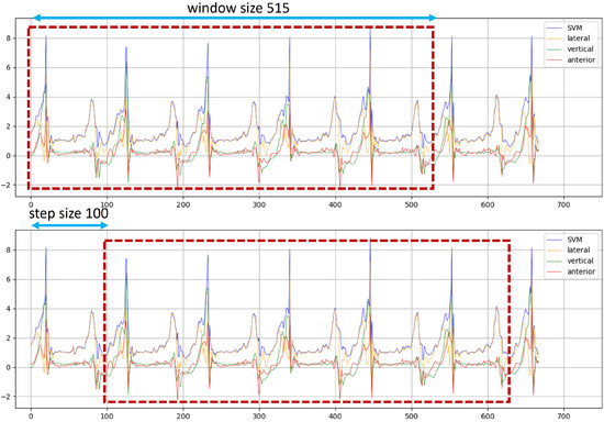 A moving average filter is a simple digital filter used to smooth or reduce noise in time series or signal data by averaging a fixed number of consecutive data points, called the window size. The window size determines how many data points are included in each average calculation; a smaller window size preserves more details but offers less smoothing, whereas a larger window size provides greater smoothing but may diminish responsiveness to short-term changes. This process helps eliminate high-frequency noise while preserving the general trend of the signal [40]. For an example of applying these filters to raw signals, please see Figure 6. We calculated the moving average filter using SVM, as per (10) and (11). For ,