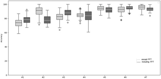 Figure 7 shows box plots derived from the data in Table 2 and Table 4. As shown in the box plots, Experiment #6, which includes the FFT feature, demonstrates the best overall performance among all the experiments. This is evident from its consistently higher median values, narrower interquartile range, and fewer outliers, indicating both superior accuracy and stability. The incorporation of the FFT feature appears to have significantly contributed to this improved performance.