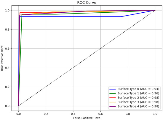 Figure 9 presents the ROC curve based on the results from Figure 8, demonstrating the model’s excellent classification performance across all sidewalk surface types [41].