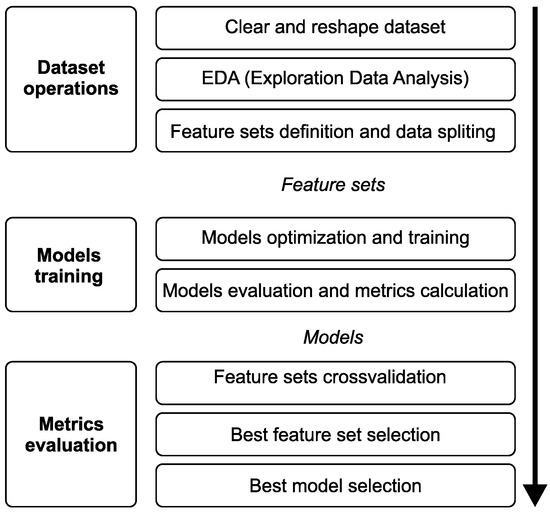 Figure 4 details the workflow and specific steps of the experiment. The procedure began with an Exploratory Data Analysis (EDA), a phase essential to acquiring a deep understanding of the characteristics of the dataset and the intricate patterns it contains. This initial analysis was critical to revealing the data structure, discovering potential correlations, and identifying any anomalies or outliers with a potential impact on the study’s results. After the EDA, the feature sets were identified and prepared. These sets were selected carefully according to their relevance and potential impact on the predictive capabilities of the models and served as the building blocks for creating other models with improved accuracy and predictive power.
