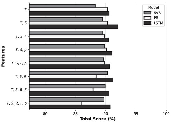 Figure 7 compares the various feature set combinations tested with the PR, SVR, and LSTM models. For each combination, the total score is relatively high, with the following observations. For combinations of two and three features, PR achieved a higher score than SVR. For combinations with more than three parameters, SVR yielded higher performance. LSTM consistently achieved the highest score in all feature set combinations. Notably, the combination of ambient temperature and solar irradiance achieved the highest total score.