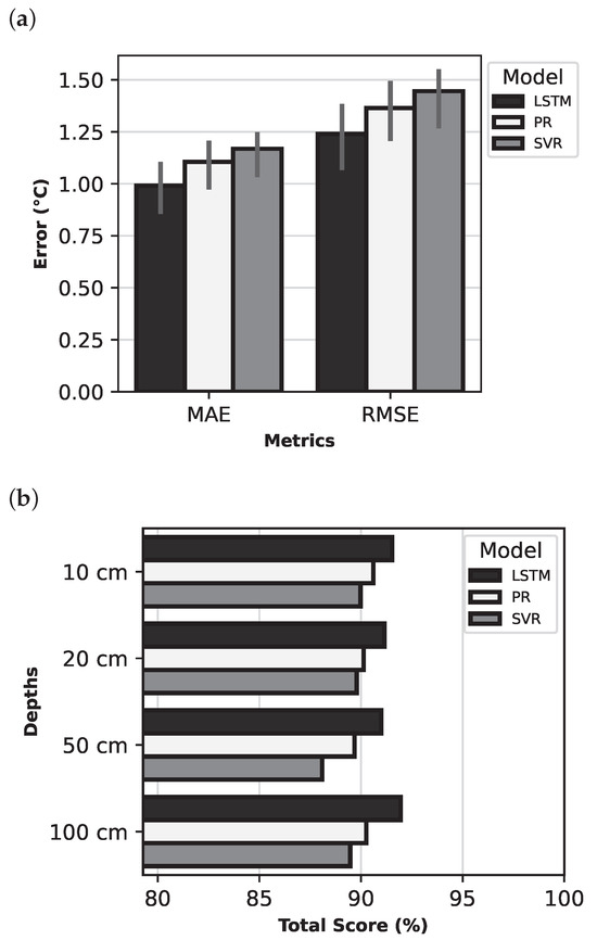 Figure 9 provides an overall comparison of the models in terms of (a) the standard metrics MAE and RMSE and (b) the total scores of the models at different soil depths. For both MAE and RMSE, the LSTM model achieved the lowest values, indicating superior performance. The graphs also depict the variability in the MAE and RMSE criteria. The line at the top of the bars represents the minimum and maximum error values, varying with depth. The LSTM model attained the highest total score, which aligns with previous observations.