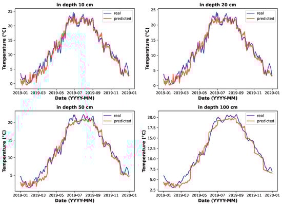 This section compares the LSTM model’s ability to predict soil temperatures at different depths with real data for the best feature set combination of ambient temperature and solar irradiance.