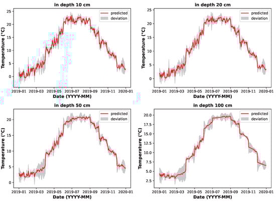 Figure 11 graphs the error deviations of predicted values over the course of one year (2019). The theoretical maximum deviation from the real data (grey) occurs in the spring season (March to April) since weather conditions change rapidly during this period and thus complicate the accurate prediction of soil temperatures. The smallest deviations, however, occur in the summer season, when the weather is generally more stable.