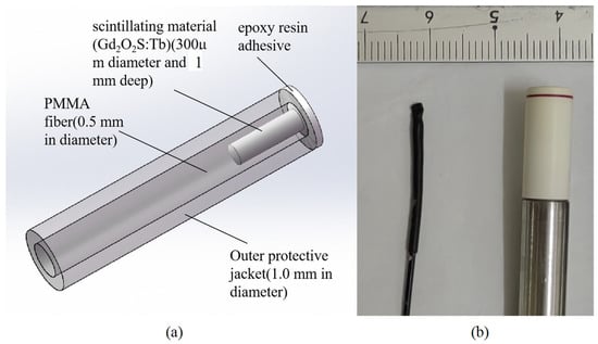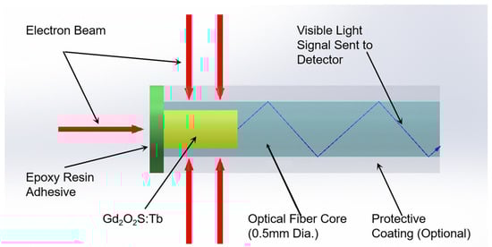 The structure of the ISD is shown schematically in Figure 1. The ISD was constructed using an SH2001-J (ESKA, Mitsubishi Rayon Co., Chiyoda-ku, Tokyo, Japan) polymethyl methacrylate (PMMA) plastic optical fiber with a core and cladding overall diameter of 500 µm. The core was micro-machined to create a 300 µm diameter and 1 mm deep hole at the tail end of the fiber []. This structure ensures sufficient signal intensity while minimizing the sensitive volume as much as possible. Gd2O2S:Tb was filled and packaged in the small hole using an epoxy resin adhesive. The principle of the ISD described in this paper relies on the conversion of the incident radiation (X-ray or electron beam) dose to a measurable optical signal in the visible wavelength range (490 nm, 545 nm and 590 nm), as shown in Figure 2, and the principle has been described by McCarthy (2014) [].