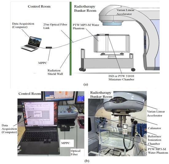 Experimental Setup: (a) Schematic layout. (b) PTW MP-M motorized three-dimensional (3D) water phantom.
