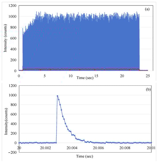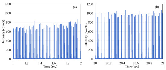 In order to illustrate the average effect of the pulses, the red trace in Figure 4 corresponds to the 1000-point moving average imposed on the data (the blue trace in Figure 4). By comparing the blue trace and the red trace in Figure 4, it can be observed that the blue trace shows an increasing trend in the first three seconds, while the red trace remains relatively stable. This appears to present a contradiction. To explain this phenomenon, we extracted data from the intervals of 1–2 s and 20–21 s for further analysis, as shown in Figure 5. The 1 s integration period was chosen to ensure that a sufficient number of micro-pulses would be captured to observe the pattern of the electron-beam pulses. It is evident that although the micro-pulse intensity in Figure 5a is relatively low, the frequency of micro-pulses is significantly higher than that in Figure 5b. Within a one-second timeframe, there are 63 micro-pulses in Figure 5a, whereas only 45 micro-pulses are observed in Figure 5b. This ensures that the red trace representing the average remains stable throughout the process, both during the initial three seconds of micro-pulse instability and the subsequent 20 s when the micro-pulse intensity is relatively constant. This phenomenon, referred to as DRS (dose rate servo), involves a type used in some Varian machines called the pulse drop servo [], which regulates the dose rate by dropping individual micro-pulses.