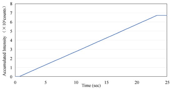 The data presented in Figure 4a were utilized to calculate the accumulated dose as recorded by the sensor. This calculation was performed by integrating the averaged dose values on a point-by-point basis. The results of Figure 6 show the linear increase in dose measured by the ISD during the application of the irradiation in macro-pulses (as shown in Figure 4a) from the linac, with a rate of increase of 2.94 × 105 per second, and the final value of the accumulated dose reaches 6.73 × 106.