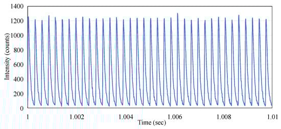 From Figure 5, it can also be observed that the micro-pulses of the electron beam do not exhibit periodicity. This phenomenon is markedly different from the pattern observed when the linac emits X-rays, where the frequency of the pulses remains stable. We conducted measurements under the same experimental conditions except for changing the radiation to X-rays with a dose rate of 600 MU/min, and the results are shown in Figure 7. This indicates that the repetition rate (frequency) of the X-ray micro-pulses is 360 Hz, which was reported by O’Keeffe (2016) [].
