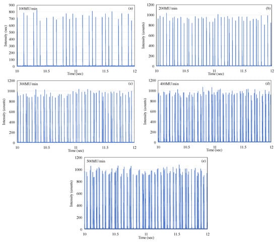 The pattern of micro-pulse delivery over a time period of 2 s was selected and recorded at a selected time of approximately 10 s, which ensures that the recording period fully coincides with the active beam delivery phase of the macro-pulse. This was repeated and recorded in the same manner as Figure 5, but with the dose rate varied from 100 MU/min (as in Figure 5) to 500 MU/min in steps of 100 MU/min. The data zoomed in to the 2 s window at the time of 10 s, corresponding to every case, are shown, respectively, in Figure 8a–e. As can be seen from Figure 8, the micro-pulses at any dose rate, over the full measurement range of 100 to 500 MU/min, do not exhibit periodicity. This phenomenon is also entirely different from the regularity of X-ray emission micro-pulses [].