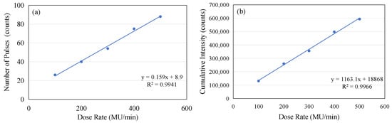 (a) The linear relationship between the number of micro-pulses captured in a 2 s window and the dose rate. (b) The linear relationship between the accumulated intensity in a 2 s window and the dose rate.