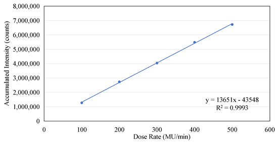 If the number of complete micro-pulses captured in each frame from Figure 8a–e is counted and the accumulated value within two seconds is calculated, the following table can be constructed (see Table 1). Although the micro-pulses of the electron beam do not exhibit periodicity, the data contained in Table 1 clearly demonstrate that there is a linear relationship between the number of complete micro-pulses captured in a 2 s window and the dose rate, as shown in Figure 9a. As the dose rate increases, a noticeable increase in the number of individual micro-pulses can be observed within a 2 s time window. Similarly, there is a clear linear relationship between the accumulated intensity within two seconds and the dose rate, as shown in Figure 9b. However, both the linearity of the pulse count and the linearity of the accumulated intensity are slightly lower (R2 = 0.9941 and 0.9966). This is mainly due to the instability of the pulses, as shown in Figure 4a. If we compare the total accumulated count within 24 s with the dose rate, we find that the linearity of the dose rate is very excellent, as shown in Figure 10. A linear regression analysis shows that the R2 value in this case is 0.9993. Also, the intercept is very close to the (0, 0) point, the y axis intercept being at (0, −43548). This corresponds to a value of 0.65% of the maximum value on the y axis.