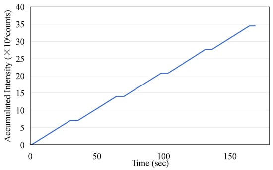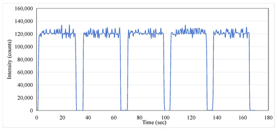 As a potential one-time, replaceable real-time dosimeter, it is necessary to evaluate whether the ISD has repeatability within a short period of time. The ISD was tested to determine its reproducibility over five exposures with each exposure at 200 MU at a dose rate of 400 MU/min for 30 s with the operating condition of a 6 MeV electron beam. The data were recorded using an MPPC with a gate time of 100 ms. Figure 11 illustrates the exceptional repeatability of the measurements across five exposures. During each phase output period, the monitored peak intensity displayed minor fluctuations, and the average intensity consistently remained around 120,000. The area under each curve during the beam’s active phase corresponds to the dose received during exposure. The integrated intensity obtained in this study is presented in Figure 12, and the data for the five-exposure test are summarized in Table 2. Given that the dose for each exposure was identical, the integrated intensity for each exposure should also be consistent. As shown in Table 2, the maximum error percentage was 1.47%, which confirms the excellent repeatability of the dosimeter in monitoring radiation doses.