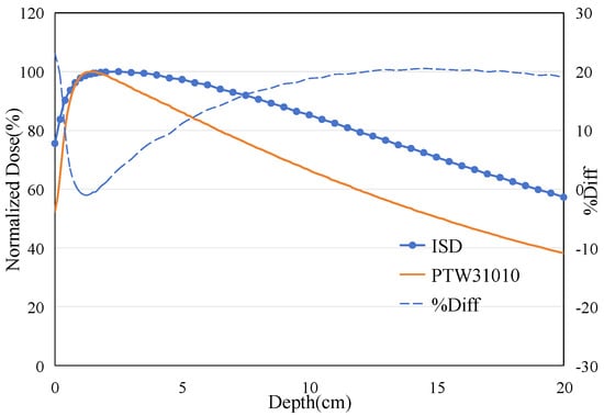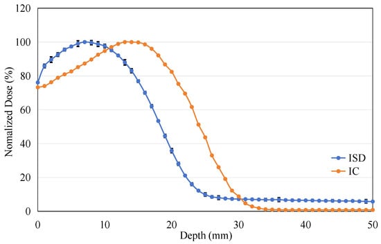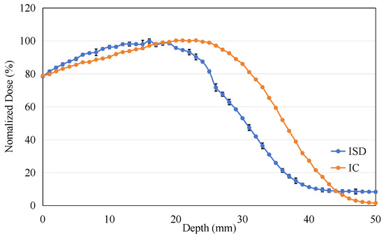 The energy of the electron beam was adjusted to 9 MeV, and the PDD experiment was repeated under identical experimental conditions, as shown in Figure 16. It can be observed that as the electron energy increases, the range of the electrons becomes longer, resulting in a significant backward shift in the maximum dose point in the PDD curves measured by both ISD and IC.
