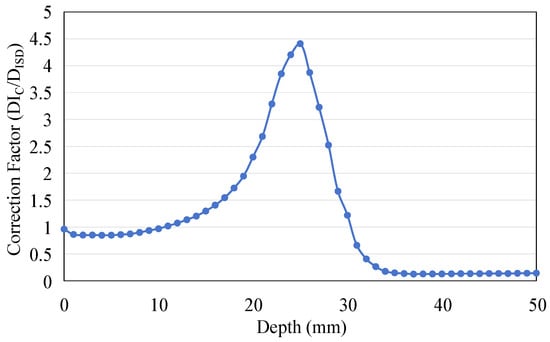 As the ratio between the radiation dose received by water (DIC) and the dose absorbed by the scintillator (DISD) confirms, the depth-dose response measured by the ISD can be calibrated by multiplying the correction coefficient. Figure 15 shows the curve of this ratio as a function of depth.