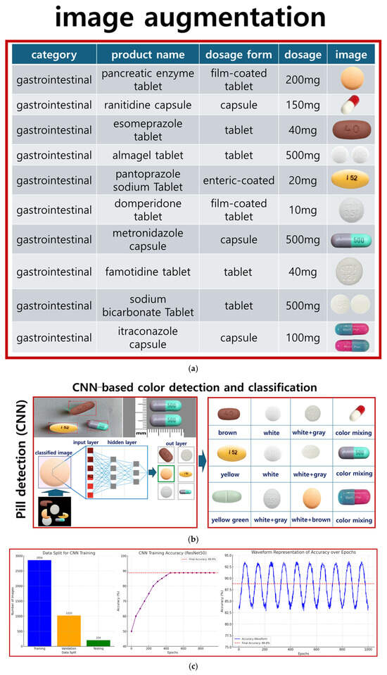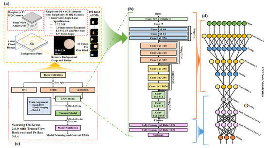 Figure 3a shows the pill collection method. The CNN model used for classification is based on ResNet50, as illustrated in Figure 3b. The batch size and number of epochs were set to 8 and 1000, respectively. Early stopping was applied during training to prevent overfitting by monitoring validation performance.