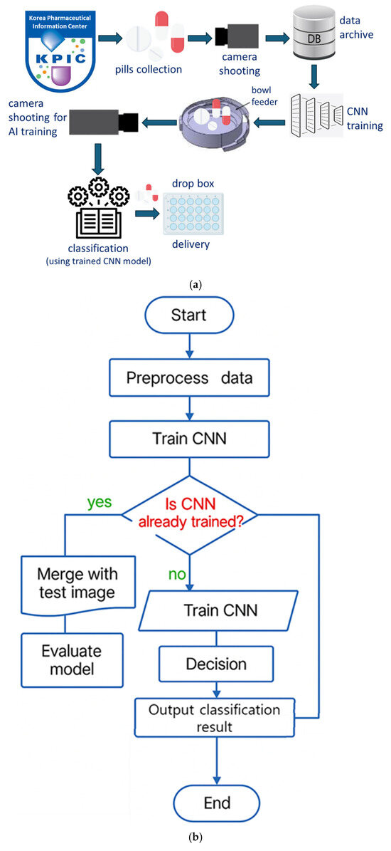 Pill classification and supply through CNN training: (a) block diagram; (b) flow chart.