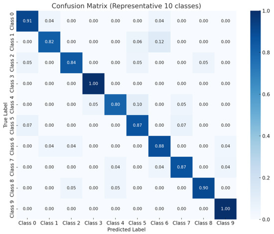 Figure 4 visualizes the classification results of the CNN model in the form of a confusion matrix for 10 representative classes selected from the total of 102 pill types. Each row represents the actual class, while each column indicates the predicted class. Therefore, higher values along the diagonal suggest higher classification accuracy for the corresponding classes.