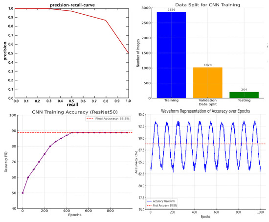 mAP is calculated by first determining the average precision (AP) for each object class, as shown in Equation (4). Here, n represents the total number of relevant items in the dataset for a given object class, and the precision of each relevant k-th item is calculated at the position where the relevant item appears in the ranked list of predicted items. The mAP is then computed as the average of all AP scores across N object classes, as shown in Equation (5). The CNN model achieved an accuracy of 88.8%, as illustrated in Figure 5.