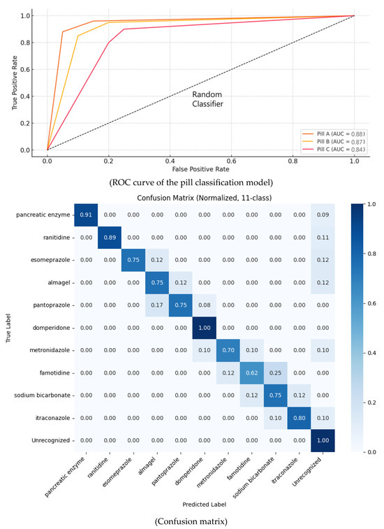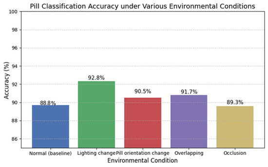 Figure 6 illustrates the robustness of the proposed CNN-based classification system under real-world conditions, such as overlapping pills, occlusion, and varying lighting environments. As shown, the model achieved classification accuracies of 91.7% under overlapping conditions, 89.3% with partial occlusion, and 92.8% in varying lighting environments, demonstrating its practical utility in clinical settings. In addition to classification accuracy, a comprehensive evaluation was performed using F1-score (mean: 0.924), ROC–AUC (mean: 0.948), and the confusion matrix shown in Figure 4. These metrics provide a detailed understanding of the model’s discriminative capabilities, especially in identifying pill types with similar shapes and colors. In particular, the ROC–AUC metric reflects the trade-off between sensitivity and specificity, where values closer to 1.0 indicate higher classification performance. Figure 4 further supports these findings by highlighting class-wise prediction confidence and misclassification patterns.