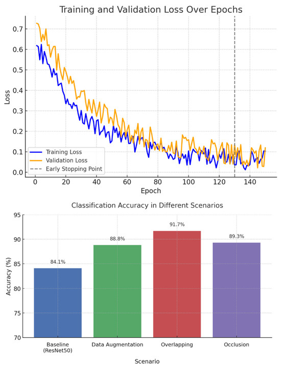 These efforts enabled the model to maintain high classification performance under diverse real-world conditions. Test results demonstrated robust accuracy, 91.7% under overlapping conditions, 89.3% under occlusion, and 92.8% under varying lighting environments, thereby validating the system’s robustness. These outcomes are summarized in Table 2 and illustrated in Figure 7.