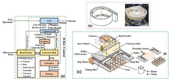 Design of the system with pills classifier unit: (a) block diagram; (b) bowl feeder structure; (c) entire structure; (d) tray (a tray the pull and push) and drop box.