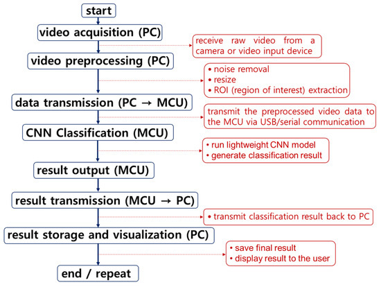 The proposed classification system is implemented with a hybrid architecture that separates the roles of the PC and the microcontroller unit (MCU), thereby maximizing computational efficiency. The overall software flow of the system is illustrated in Figure 10. First, the PC is responsible for acquiring the original images and performing initial preprocessing. Specifically, it carries out operations such as noise reduction, image resizing, and region of interest (ROI) extraction to optimize the image data before it is transferred to the MCU for inference. The PC also serves as the user interface, enabling the storage and visualization of the final classification results. Once preprocessing is complete, the image data is transmitted to the MCU via USB or serial communication. On the MCU side, in a lightweight CNN model—optimized for embedded environments—classification results are processed immediately within the MCU and optionally delivered to the user through notifications or other interfaces.