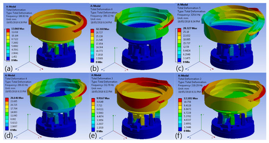 Bowl feeder design and vibration simulation results with PWM of 20%: (a) vibration (z-axis rotation: 0.5 mm @ 4.0 Hz), (b) vibration (z-axis rotation: 0.86 mm @ 12 Hz), (c) vibration (y-axis rotation: 0.62 mm @ 0.6 Hz), (d) vibration (y-axis rotation: 15 mm @ 40 Hz), (e) (x-axis rotation: 0.9 mm @ 32 Hz), (f) vibration (x-axis rotation: 15 mm @ 40 Hz).