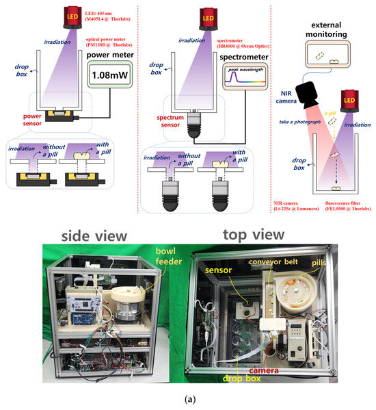 The experimental procedure to obtain results involves pill imaging, pill classification through CNN training, bowl feeder performance assessment, and conveyor belt operation, ensuring that the pills accurately fall into the drop box placed on the tray. Therefore, a 405 nm LED (M405L4, Thorlabs, NJ, USA), spectrometer (Ocean Optics HR4000, Thorlabs, NJ, USA), optical power meter (PM130D, Thorlabs, NJ, USA), and a fluorescence wavelength pass filter (long-pass filter @ 400–500 nm, FEL0500, Thorlabs, NJ, USA) were used in combination with a near-infrared (NIR) color mode camera (Lt-225c, Lumenera, Thorlabs, NJ, USA), as shown in Figure 13. In the first experimental method, after mounting the spectrometer probe on the drop box, the 405 nm LED is irradiated. Before the pills fall into the drop box, the spectrometer detects a high intensity value. When a pill falls into the drop box, it covers the spectrometer probe, preventing it from measuring the irradiated light, thus causing the intensity value to decrease.