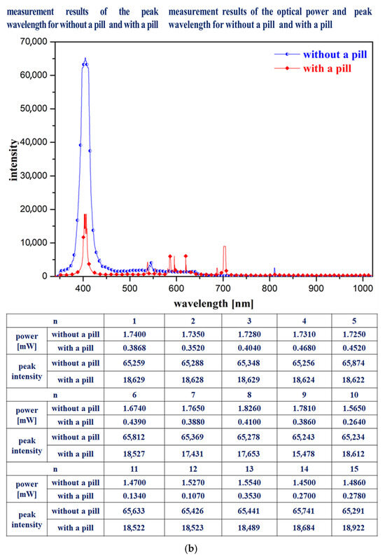 The second experimental method involves irradiating the 405 nm LED after placing the optical power meter sensor inside the drop box. Before pills fall into the drop box, the optical power meter shows a high-power value. However, when a pill falls into the drop box and covers the sensor, the optical power meter cannot detect the light source, resulting in a lower power value.