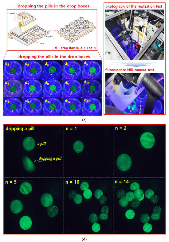 System performance evaluation: (a) manufactured system, (b) measurement results for optical spectrum, (c) imaging scanning with dividing and dripping a pill using fluorescence NIR camera, (d) imaging scanning with quantity of dripping a pill using fluorescence NIR camera (see Supplementary Video S1).
