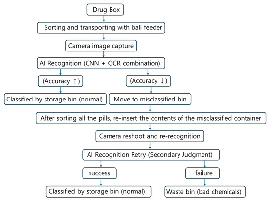 To overcome these limitations, a multi-stage classification and reprocessing framework was proposed. Pills with low confidence scores or classification failures were not immediately sorted, but instead redirected to a dedicated “misclassification container” to prevent incorrect categorization. After the initial classification cycle, the pills in this container were reintroduced into the system for re-imaging and re-identification from different angles or orientations. Pills that remained unidentifiable after repeated attempts were considered to have a high risk of misclassification, and were subsequently discarded to ensure medication safety for patients. This iterative reprocessing loop effectively improved classification accuracy without increasing system complexity. Without the need for additional mechanical rotation devices or manual intervention, a practical and scalable solution was achieved through AI-based repeated recognition and classification.