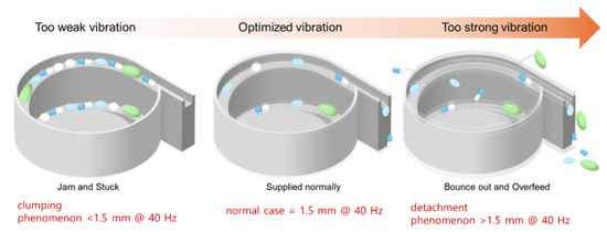 The motor, sensor, conveyor, and timing belt were connected to the bowl feeder to insert the tablets and operate the system. The most important factors in the operation of the bowl feeder are voltage, torque, speed, PWM, and vibration amplitude. As shown in Figure 12, a performance test was conducted with a bias voltage of 5 V, a torque speed of 20 rpm, a PWM of 20% (@ 40 Hz), and a vibration amplitude of 1.5 mm. The main objective of this test was to obtain optimized parameters for the stable control and operation of the bowl feeder.