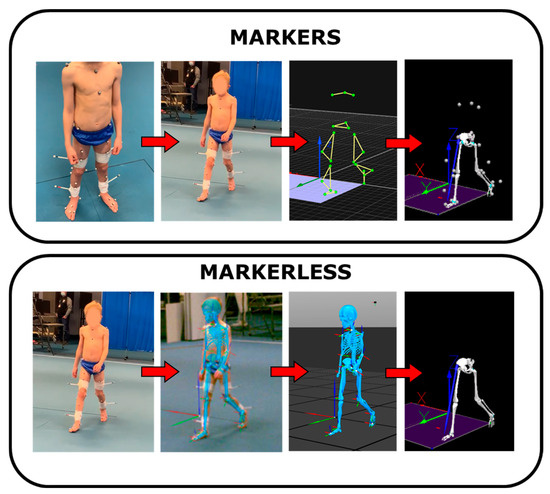 The current gold standard for assessing gait is three-dimensional (3D) gait analysis. This requires the accurate placement of small skin-mounted markers on anatomical landmarks on the body. The positions of these markers are then measured using infrared cameras to calculate joint angle graphs (and moments and powers when synchronous force data is captured). This is a highly technical analysis that is time-consuming (with a reported median duration of 80 min for subject preparation, data collection, and physical examination across Europe [2]), requires minimal clothing, can trigger anxiety, and thereby may lead to an unnatural walking pattern [3,4]. These challenges are particularly prevalent in very young children, those with sensory processing difficulties, and children with behavioural problems or intellectual disabilities [3]. Despite the challenges, 3D gait analysis remains clinically valuable for identifying gait deviations in these children. Therefore, identifying methods that reduce the burden of data collection, while maintaining sufficient accuracy, is essential to ensure the continued clinical utility of gait analysis in these groups. Furthermore, even when markers are placed accurately by a highly skilled practitioner, soft tissue artefacts remain an unsolved problem despite numerous solutions developed to reduce inaccuracies [5,6,7]. Bone deformities, and especially torsional deformities, can cause further inaccuracies in marker placement [8].