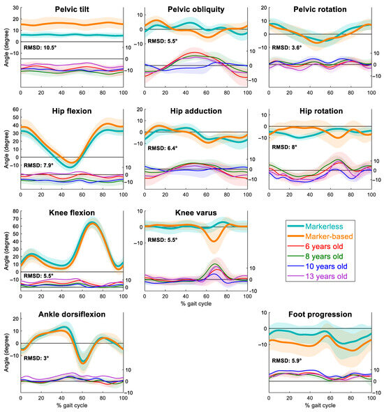 The difference between marker-based and markerless data also depended on age and was especially notable for pelvis tilt, pelvis obliquity, hip and knee flexion/extension, hip abduction/adduction, and hip rotation (Figure 1). Among these, 10-year-olds exhibited the smallest differences in pelvis obliquity and hip abduction/adduction. In contrast, the largest differences in hip flexion/extension and hip rotation were observed in both 8- and 10-year-olds, while the 13-year-olds showed the greatest discrepancies in knee flexion/extension.