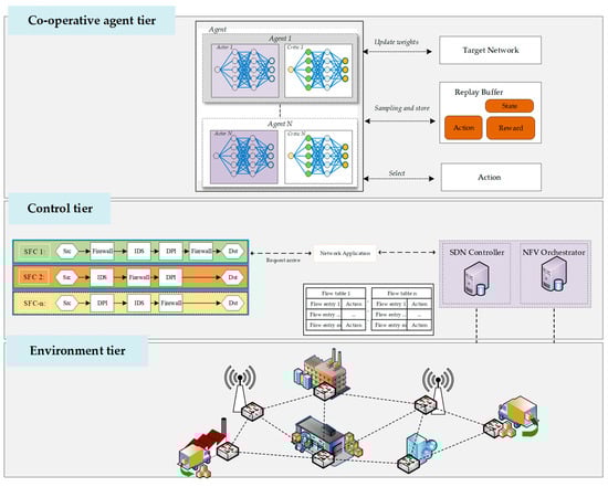 To address these limitations, Deep Reinforcement Learning (DRL) has gained attention as a powerful agent for making intelligent, adaptive decisions in highly dynamic networking [,]. By considering various system interactions, DRL-driven approaches can continuously learn from the network environment and SFC placements [,,,,]. As shown in Figure 1, leveraging the DRL-integrated MEC framework can intelligently allocate VNFs to ensure SFCs are deployed to maximize resource efficiency, minimize latency, and maintain high reliability, even amid unpredictable traffic fluctuations as the workload changes.