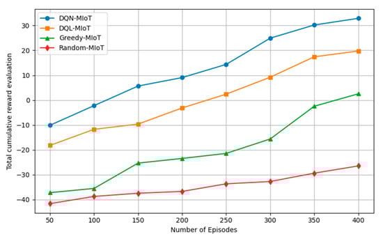 In this section, we present the results for the proposed DQN-MIoT and reference schemes, namely DQL-MIoT, Greedy-MIoT, and Random-MIoT, in terms of cumulative reward, sub-rewards for latency and energy, packet drop ratio, packet delivery ratio, throughput, and delay in services. The measurement of this performance metric significantly showcases how our system setting integrates with the DQN framework, ensuring the reliability of chaining VNFs and adjusting for resource differences under diverse applications and workloads. The same topology and task size are used in this simulation, but the controller and agent differ in terms of performance metrics. The result demonstrates the total reward throughout each significant scheme’s DQN phase for exploration and exploitation within 400 episodes. Figure 3 illustrates the results of the proposed method, showing the total reward over 400 episodes, as defined in Equation (8). During the early learning phase (episodes 0–100), all approaches begin with negative cumulative rewards due to random policy exploration and ineffective action selection. As training progresses, DQN-MIoT shows a rapid improvement, achieving a positive cumulative reward after approximately 150 episodes, steadily increasing to 32.89 at episode 400. Meanwhile, DQL-MIoT gradually improves and achieves a final cumulative reward of 19.74, which is approximately 40% lower than DQN-MIoT. The Greedy-MIoT method shows minimal improvement, ending with a cumulative reward of only 2.53, which is approximately 92% lower than that of DQN-MIoT. The Random-MIoT baseline performs the worst, consistently maintaining negative rewards and ending at −26.48, indicating no effective learning or adaptation.