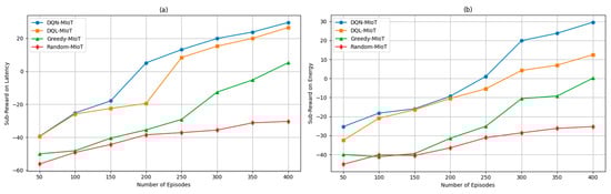 In Figure 4a, initially, all methods exhibit negative sub-rewards, indicating poor latency performance due to random or sub-optimal policy actions during early learning phases. However, by episode 200, the DQN-MIoT approach begins to yield positive sub-reward values, signaling a successful adaptation to the MEC workload dynamics in IoT scenarios. As learning continues, DQN-MIoT and DQL-MIoT demonstrate robust convergence behavior, with DQN-MIoT consistently achieving higher sub-reward values than DQL-MIoT. By episode 400, DQN-MIoT achieves a latency sub-reward of 29.57, compared to 26.51 for DQL-MIoT, only 5.17 for Greedy-MIoT, and −30.31 for random-MIoT. This substantial gap underscores the benefits of employing a value-based Q-value with optimized exploration strategies for latency-sensitive SFC placement. Figure 4b illustrates the efficiency of energy score points as DQN-MIoT’s training process transitions the agent into a more stable policy regime, resulting in a higher immediate reward score. DQN-MIoT demonstrated a steady improvement, eventually peaking as the training progressed due to its adaptive learning strategy, which optimized energy consumption under network constraints. In contrast, DQL-MIoT showed more gradual progress, reflecting its slower convergence in handling energy efficiency within the MEC-enabled IoT environment. The Greedy-MIoT and Random-MIoT consistently underperformed with negative energy sub-rewards throughout most episodes, as they lacked adaptive mechanisms to manage resource allocation effectively. From the reward efficiency perspective, the proposed DQN-MIoT scheme dynamically adjusts resource allocation and offloading decisions, effectively balancing computational capacity and energy constraints. This adaptability enables improved handling of resource-constrained and computation-intensive tasks within the network, demonstrating strong suitability for MEC-enabled IoT scenarios where energy efficiency and task completion are crucial.