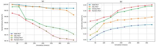 Performance metrics of (a) packet delivery and (b) packet drop ratio.