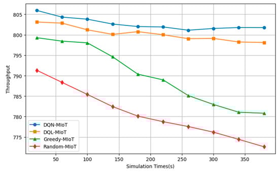 The throughput results presented in Figure 6, across different simulation times, further reinforce the superior performance of the DQN-MIoT approach compared to DQL-MIoT and Greedy-MIoT. At 20 s, DQN-MIoT achieves the highest throughput of 805.94 units, slightly surpassing DQL-MIoT (803.12) and notably outperforming Greedy-MIoT (799.28). DQN-MIoT maintains a stable throughput at 801.75, while DQL-MIoT, Greedy-MIoT, and random-MIoT drop to 798.11, 780.82, and 772.63, respectively. This steady trend indicates the DQN-MIoT model’s efficiency in handling data traffic under varying load conditions.