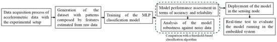 The machine learning classification algorithm is based on a MLP architecture implemented by Keras Tensorflow libraries in Python 3.10.0. The choice of this type of artificial neural network, among the wide variety of available machine learning algorithms, is justified by its ease of implementation in the embedded sensing node. For the sake of completeness, in Section 4, a comparison between the performance of the MLP algorithm against that of three other standard machine learning techniques is discussed.