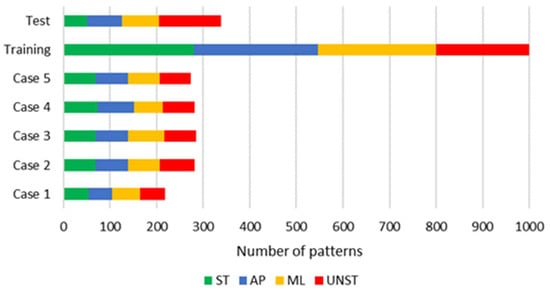 Details of the dataset composition, for each investigated behavior and considered case, are represented in Figure 3. Patterns have been extracted by 20 records that last between 60 s and 87 s and have been collected in laboratory with standard environmental conditions (i.e., room temperature and pressure, which, anyway, are not expected to affect the system’s behavior). The number of patterns depends on the length of the acquisitions, which is different for each of the classes considered due to practical reasons. Five different cases have been considered, which are characterized by different heights of the sensor node mounted on the structure. This allows for the assessment of the classification methodology’s robustness against different node positions.